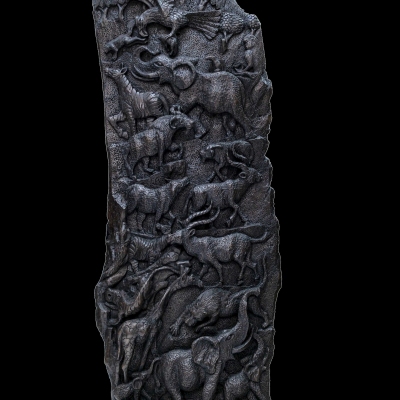 This piece is a breathtaking vertical relief sculpture that captures the vibrant and untamed spirit of the wild. Carved with meticulous detail and a deep appreciation for nature, the artwork features a dense, interwoven composition of wildlife. The visual journey ascends from the grounded strength of a majestic elephant family at the rocky base, winding upward through a dynamic ecosystem of giraffes, lions, gazelles, and other savanna creatures, culminating with a powerful bird of prey taking flight at the pinnacle.The dark, rich finish of the material highlights the intricate depth and dramatic shadows of the high-relief carving. This masterful use of space creates a sense of continuous motion and interconnectedness, making this a striking statement piece that celebrates the raw beauty, hierarchy, and harmony of the natural world.