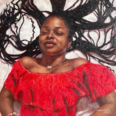 “A Glimpse into the Unseen” presents a serene woman reclined in a flowing red gown, her beautifully styled hair scattered gently around her as she rests with her eyes closed. The composition balances vibrancy and stillness—passion and surrender—through the striking presence of red against a calm, contemplative atmosphere.The red gown symbolizes passion, strength, and emotional depth, grounding the work in intensity while her posture evokes quiet introspection. Her closed eyes suggest not sleep, but inner vision—a journey beyond the physical realm into spaces where intuition and spirit reside. The scattered hair reflects freedom and release, reinforcing a sense of vulnerability and grace.Rendered in oil, the rich textures and layered brushwork heighten the contrast between movement and calm, inviting viewers to pause, reflect, and enter a realm that exists just beyond sight.